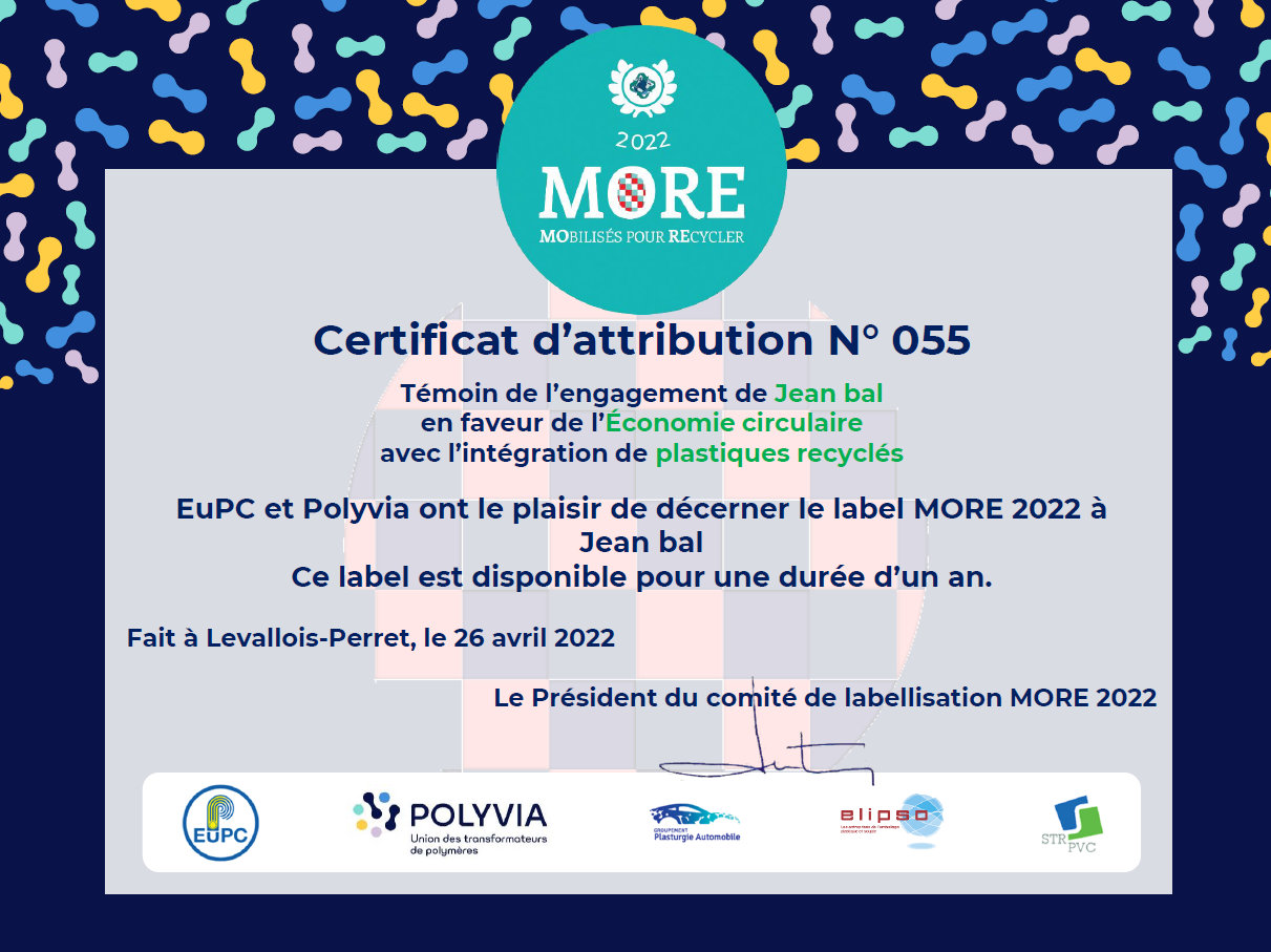 Jean Bal s’engage dans une véritable économie circulaire, contribuer ainsi à l’objectif de 100% de plastique recyclé en 2025 fixé par la fédération de la plasturgie.